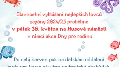 Srdečně vás zveme k návštěvě našeho stánku, kde na vás bude čekat řada her, soutěží a zábavných aktivit pro malé i velké. Těšit se můžete i na prodej vyřazených knih. Zároveň bychom vás rádi pozvali na slavnostní vyhlášení výsledků soutěže Lovci perel, která probíhala na dětském oddělení knihovny od 1. září 2024 do 16. května 2025. Soutěže se mohly zúčastnit všechny děti a mládež do 15 let. V 15 hodin proběhne slavnostní vyhlášení nejlepších lovců – tedy těch, kdo přečetli nejvíce soutěžních knih a úspěšně zodpověděli připravené otázky. Vstup zdarma.
