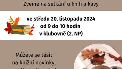 Zveme Vás na tradiční setkání u šálku kávy. Můžete se těšit na knižní novinky, povídání o literatuře a enneagramu Vstup zdarma Pořádá Městská knihovna Nové Město nad Metují www.knihovnanm.cz
