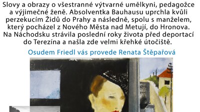 Pohnutá, naplněná a krutě ukončená pouť velké ženy na trase Vídeň - Výmar - Berlín - Praha - Hronov - Terezín -Osvětim. Absolventka Bauhausu uprchla kvůli perzekucím Židů z Vídně do Prahy a následně, spolu s manželem, pocházejícím z Nového Města nad Metují, do Hronova. Na Náchodsku strávila poslední roky před deportací do Terezína a našla zde velmi křehké útočiště. Slovy a obrazy Vás osudem všestranné výtvarné umělkyně, pedagožky a výjimečné ženy provede Renata Štěpařová. Vstupné dobrovolné.