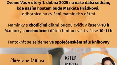 Zveme Vás v úterý 1. dubna 2025 na dopolední setkání, kde naším hostem bude Markéta Hrádková, odbornice na cvičení maminek s dětmi. Můžete se těšit na cvičení pro malé děti, cviky formou hry a na tipy, jak doma s dětmi zábavně cvičit.