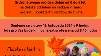 Zveme rodiče s dětmi děti od 0 do 4 let na setkání v rámci projektu Bookstart S knížkou do života. Můžete se těšit na knížky a aktivity se zimní a vánoční tematikou. Představíme vám knižní novinky a příběhy pro vánoční čas. Sejdeme se v 9 hodin na dětském oddělení. Knihovna pro vás bude extra otevřena od 8:45, kočárky a odrážedla si můžete zanechat v průjezdu knihovny, který bude po dobu setkání uzamčen.