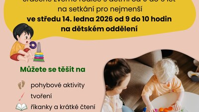 Srdečně zveme rodiče s dětmi od 0 do 6 let na první setkání v novém roce. Sejdeme se ve středu 14. ledna 2026 od 9 do 10 hodin na dětském oddělení. Můžete se těšit na pohybové aktivity, tvoření, říkanky a krátké čtení, knižní tipy a novinky, hraní si a zábavu. Noví návštěvníci obdrží set S knížkou do života.