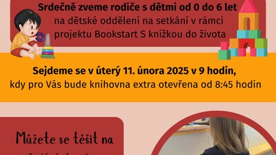 Zveme rodiče s dětmi děti od 0 do 6 let na setkání v rámci projektu Bookstart S knížkou do života. Můžete se těšit na říkanky, vyrábění, hry a tipy na skvělé knížky pro nejmenší. Každé dítě od nás obdrží sadu S knížkou do života, která obsahuje například knihu, časopis či záložku. Sejdeme se v 9 hodin na dětském oddělení. Knihovna pro vás bude extra otevřena od 8:45, kočárky a odrážedla si můžete zanechat v průjezdu knihovny, který bude po dobu setkání uzamčen.