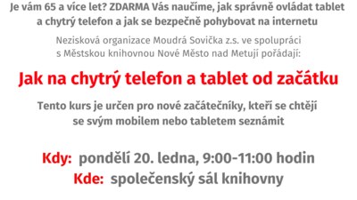 Je vám 65 a více let? ZDARMA vás naučíme, jak správně ovládat tablet a chytrý telefon. Tento kurz je určen pro nové začátečníky, kteří se chtějí se svým mobilem nebo tabletem seznámit. Nutné přihlášení do 17. 1. na tel. 733129844. Nabízíme zápůjčku telefonu či tabletu.