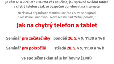 Je vám 65 a více let? ZDARMA vás naučíme, jak správně ovládat tablet a chytrý telefon. Tento kurz je určen pro mírně pokročilé uživatele. Nutné přihlášení na tel. č. 733 129 844 nebo osobně na oddělení pro dospělé. Nabízíme zápůjčku telefonu či tabletu. Vstup zdarma.