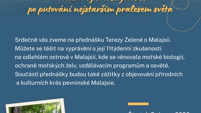 Srdečně vás zveme na přednášku Terezy Zelené o Malajsii. Můžete se těšit na vyprávění o její 11týdenní zkušenosti na odlehlém ostrově v Malajsii, kde se věnovala mořské biologii, ochraně mořských želv, vzdělávacím programům a osvětě. Součástí přednášky budou také zážitky z objevování přírodních a kulturních krás pevninské Malajsie.