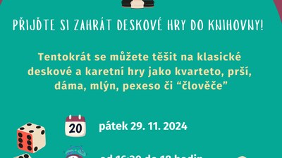 Přijďte si zahrát deskové hry do knihovny! Tentokrát se můžete těšit na klasické deskové a karetní hry jako kvarteto, prší, dáma, mlýn, pexeso či “člověče”. Vstup zdarma Pořádá Městská knihovna Nové Město nad Metují www.knihovnanm.cz