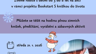 Zveme rodiče s dětmi od 3 do 8 let na akci v rámci projektu Bookstart - S knížkou do života. Můžete se těšit na hodinu plnou knížek se zimní tématikou, předčítání, vyrábění a zábavných aktivit. Noví návštěvníci od nás obdrží dárkovou sadu S knížkou do života.