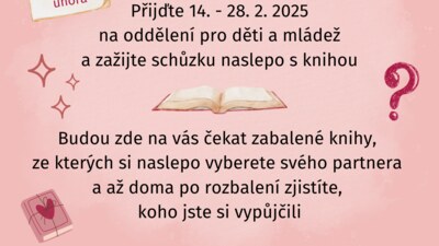 Přijďte 14. - 28. 2. 2025 na oddělení pro děti a mládež a zažijte schůzku naslepo s knihou. Budou zde na vás čekat zabalené knihy, ze kterých si naslepo vyberete svého partnera a až doma po rozbalení zjistíte, koho jste si vypůjčili Snad vám rande vyjde a budete svým knižním partnerem příjemně překvapeni. Pokud však schůzka nebude podle vašich představ, tak knihu budete moci kdykoli bez výčitek vrátit. V balíčku naleznete i lístek, ve kterém budete moci zhodnotit knihu a po jeho odevzdání do 14.3. 2025 obdržet odměnu.