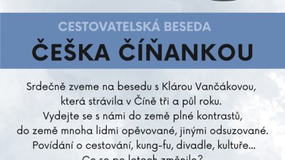 Přijměte pozvání na výlet do země plné kontrastů, mnoha lidmi opěvované, jinými odsuzované. Klára Vančáková, která vás večerem provede, strávila v Číně 3,5 roku. Povídání o cestování, kung-fu, divadle, kultuře... Co se po letech změnilo?