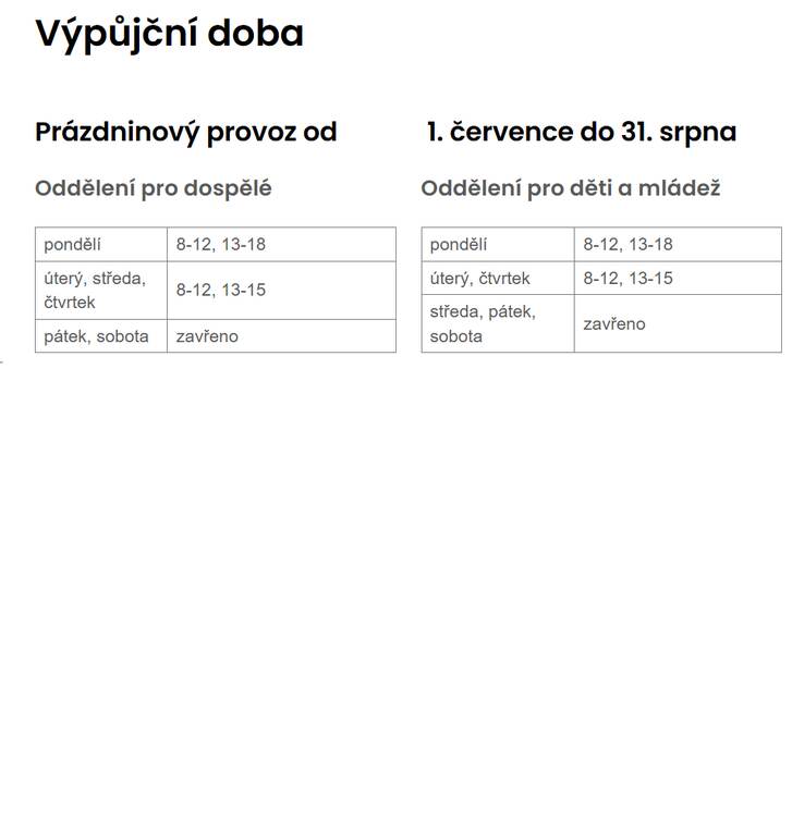 Léto je čas dovolených, cestování a aktivního odpočinku zejména v přírodě. V červenci a srpnu proto pravidelně klesá návštěvnost knihovny. Na základě statistik využívání knihovny jsme se opět rozhodli jít v letních měsících cestou zkrácené provozní doby a nikoli celkové uzavírky.