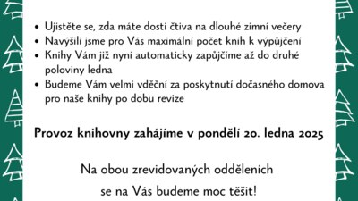 Provoz knihovny znovu zahájíme v pondělí 20. ledna 2025, kdy se na Vás v obou zrevidovaných odděleních i pobočkách budeme moc těšit!