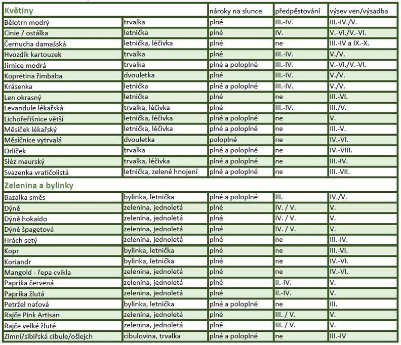 Semínka uvedená v tabulce nemusí být všechna dostupnáa naopak se mohou objevit nová, i to patří k filozofii Semínkoven. Aktualizovat tabulku budeme na začátku další sezony.